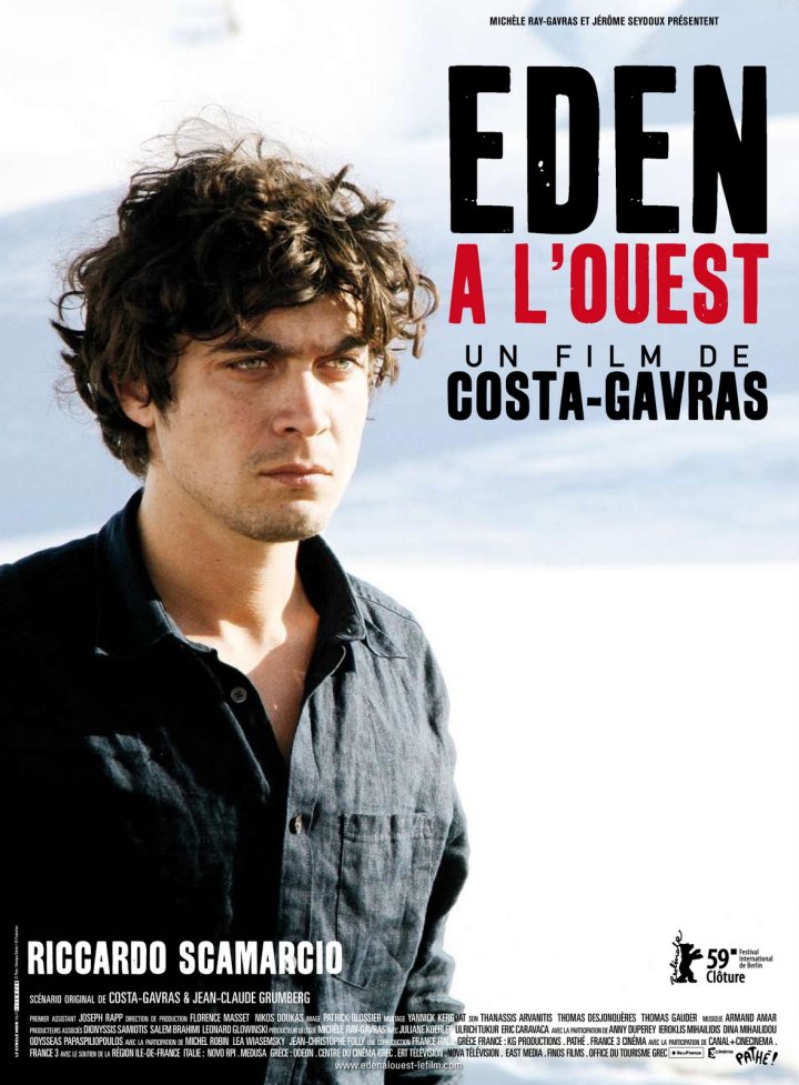 El Edén está al Oeste es una película franco griega dirigida y escrita por Constantine Costa-Gavras quien seleccionara al destacado actor italiano Riccardo Scamarcio en el role principal de Elías. Es una historia que retrata el espinoso asunto de los inmigrantes en una Europa cada vez más xenófoba. A bordo de una barco hacinado de inmigrantes ilegales un grupo de hombre se lanza al mar hasta nadar a la costa cuando el navío se ve descubierto por la policía.