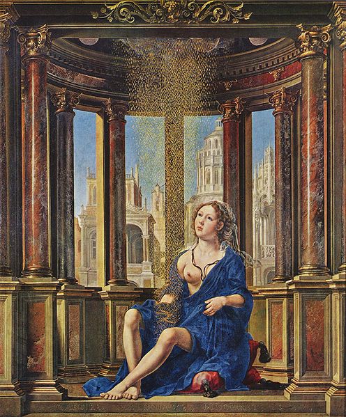 Para evitar esta aseveración, el rey Acrisio recluyó a su hija en una cámara subterránea o en una torre de bronce, totalmente sellada. Sin embargo, el todopoderoso Zeus, el más enamoradizo de los dioses, se enamora de ella y trata de poseerla recurriendo a una de sus múltiples engaños o metamorfosis con mortales (ya se había convertido en cisne para unirse a Leda, adoptado la apariencia de Anfitrión para poseer a su esposa Alcmena, se transformó en toro manso para amar a Europa, en la mismísima diosa Artemis para yacer con su ninfa Calisto). Todo ocurrió en una noche estrellada, Dánae yacía desnuda en su lecho mientras soñaba con la ansiada libertad, cuando por una de las rendijas de la cámara, apareció Zeus, quien transformándose en una suavísima lluvia dorada, entró dentro de la habitación. Así, gota a gota, fue cayendo Zeus sobre el cuerpo desnudo y asustado de Dánae, impresionada por tan importante visita. Estas gotas doradas, uniéndose en un abrazo luminoso y vibrante, la poseyeron, introduciéndole la semilla de una nueva vida: la del futuro héroe Perseo.